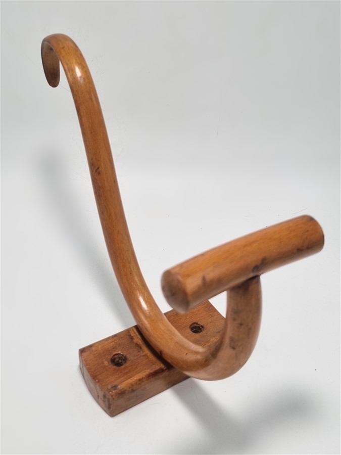 Cette ancienne patère en bois courbé, dans l’esprit Thonet ou Baumann, a une teinte miel.