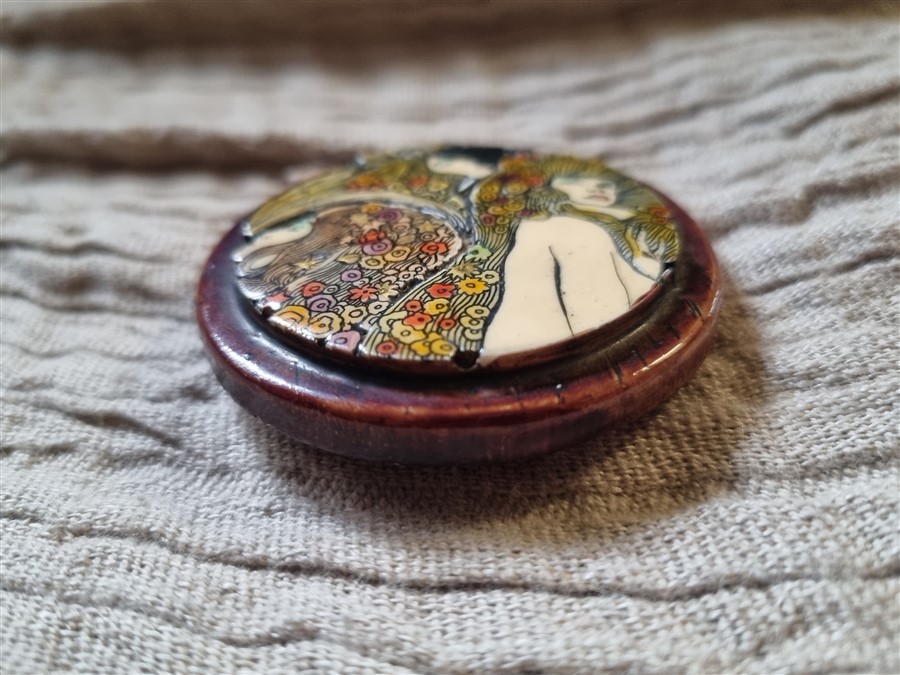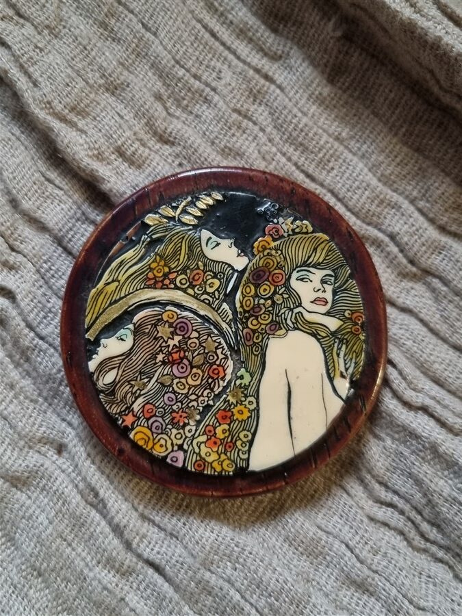 Jolie composition mettant en scène 3 visages féminins aux chevelures opulentes, sinueuses et motifs floraux sur une broche en résine façon bois. D’inspiration Art Nouveau, cette broche rend un hommage direct au style emblématique de Mucha ou encore Gustav Klimt.