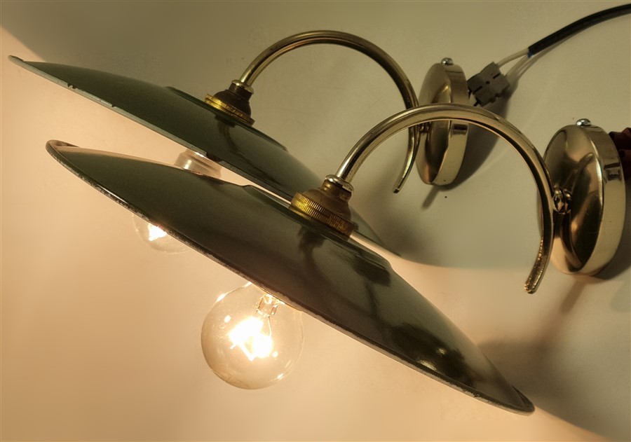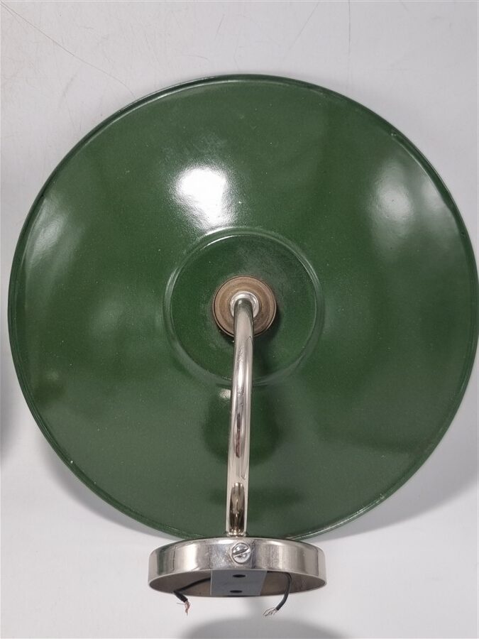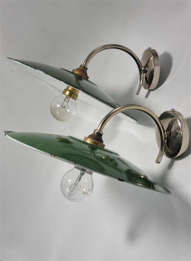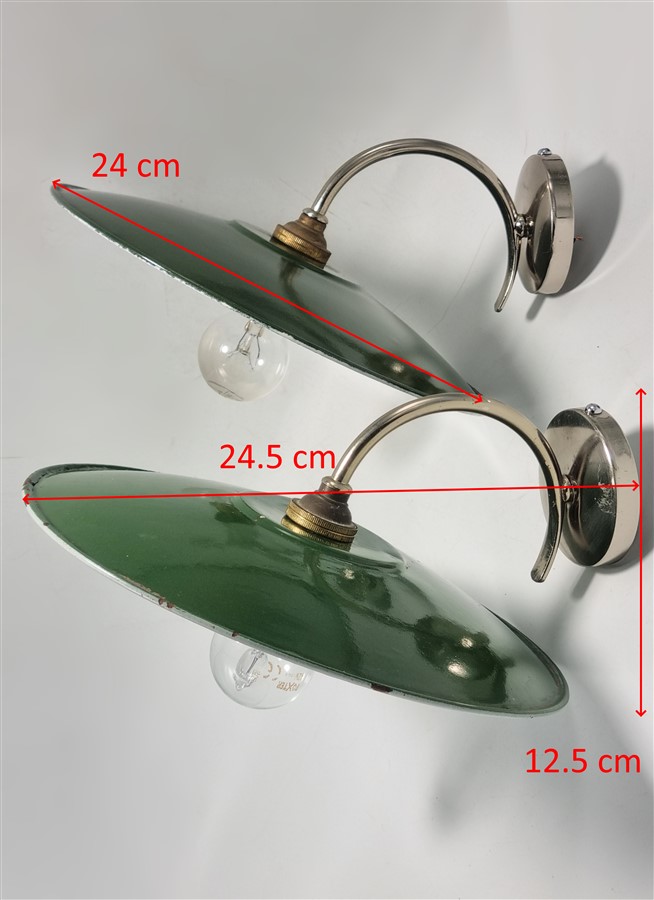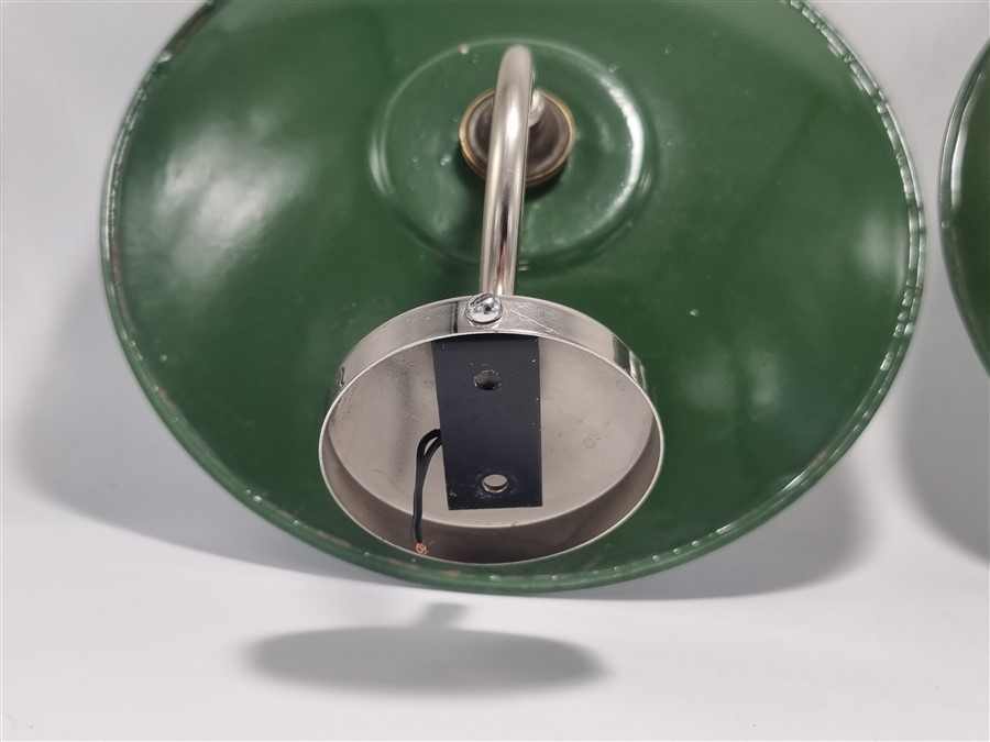 Anciennes tôles émaillées vertes montées sur des bases d’appliques murales de couleur argentée. L’ensemble présente quelques traces, toutefois rien d’important n’est à signaler.