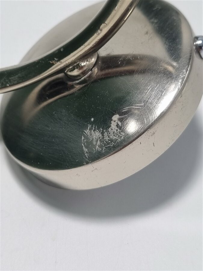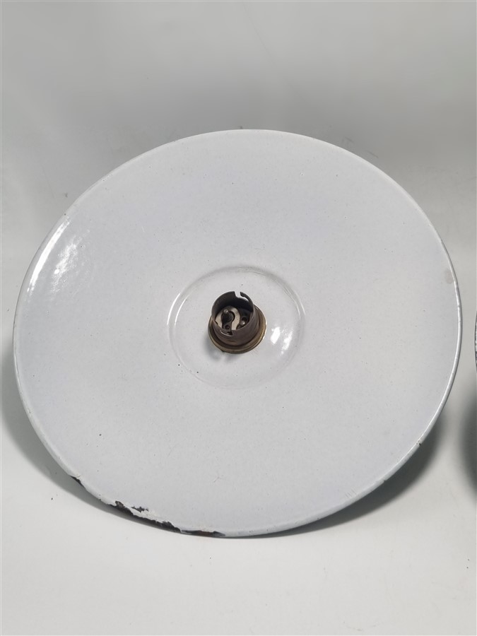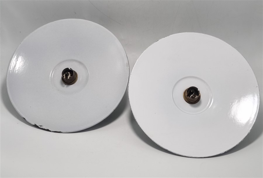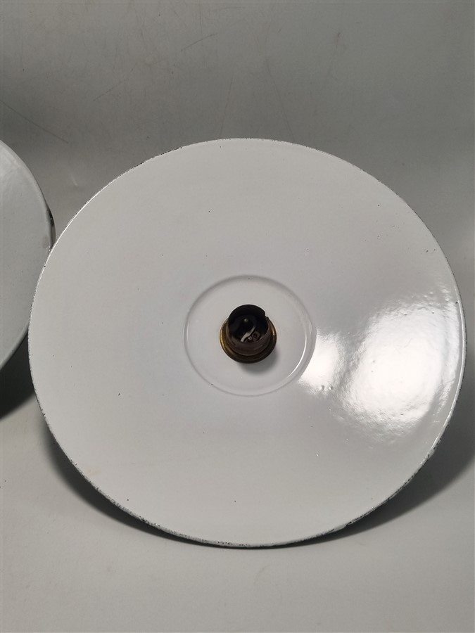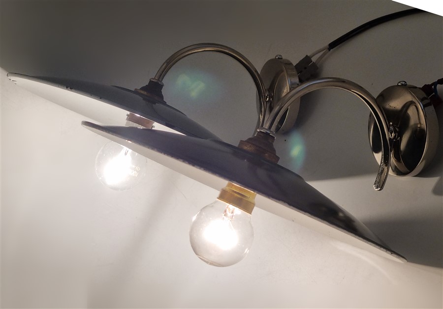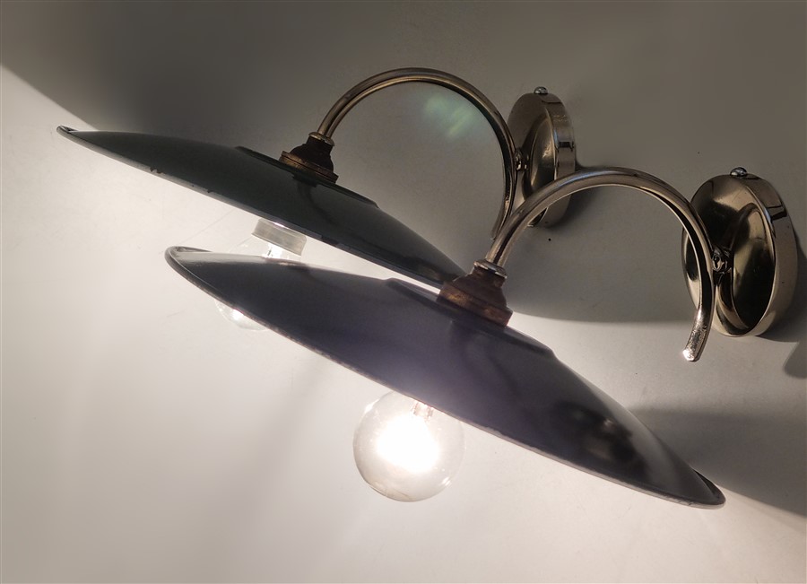 Anciennes tôles émaillées vertes montées sur des bases d’appliques murales de couleur argentée. L’ensemble présente quelques traces, toutefois rien d’important n’est à signaler.