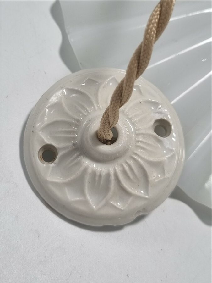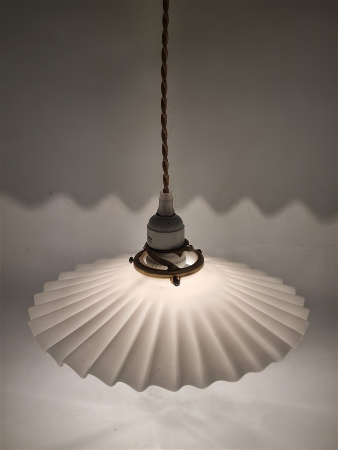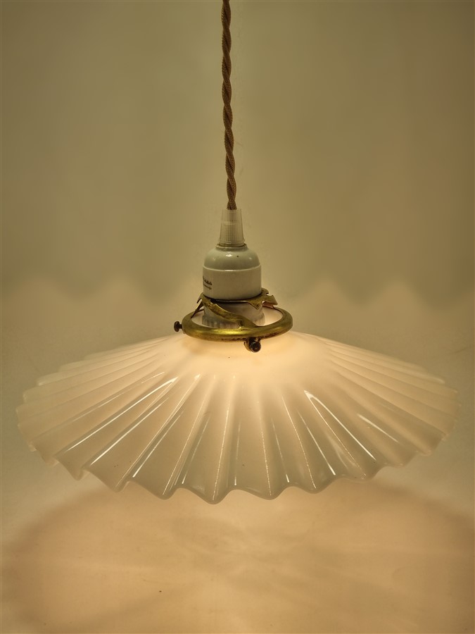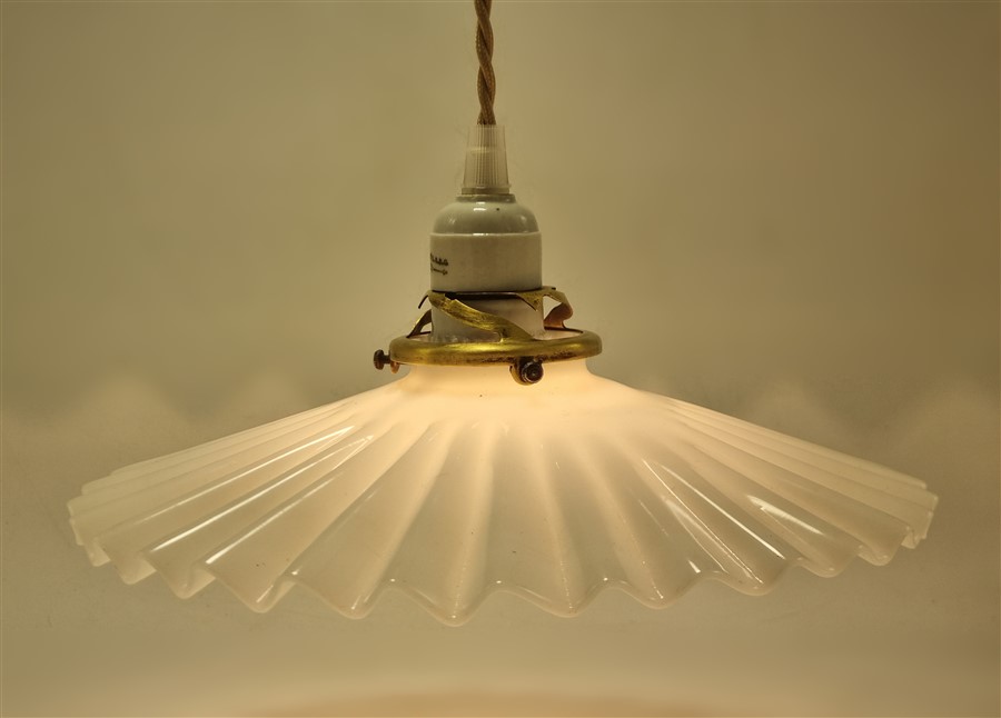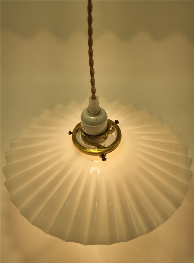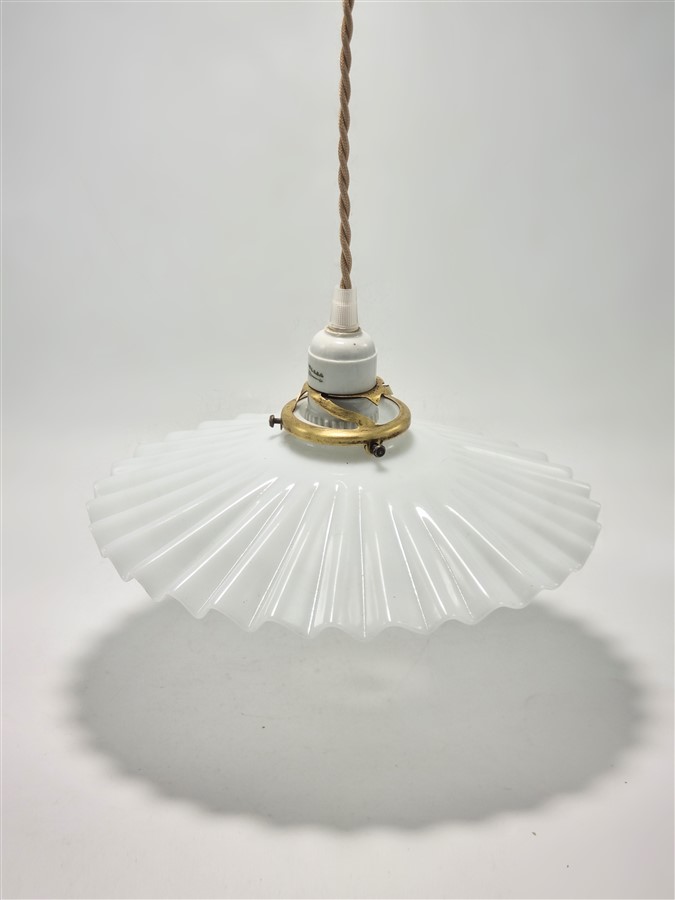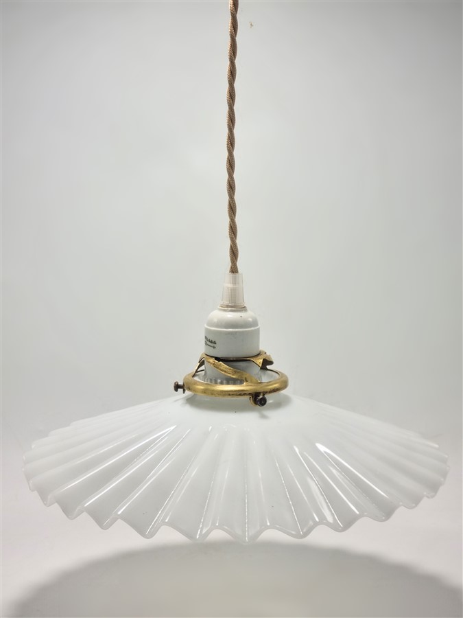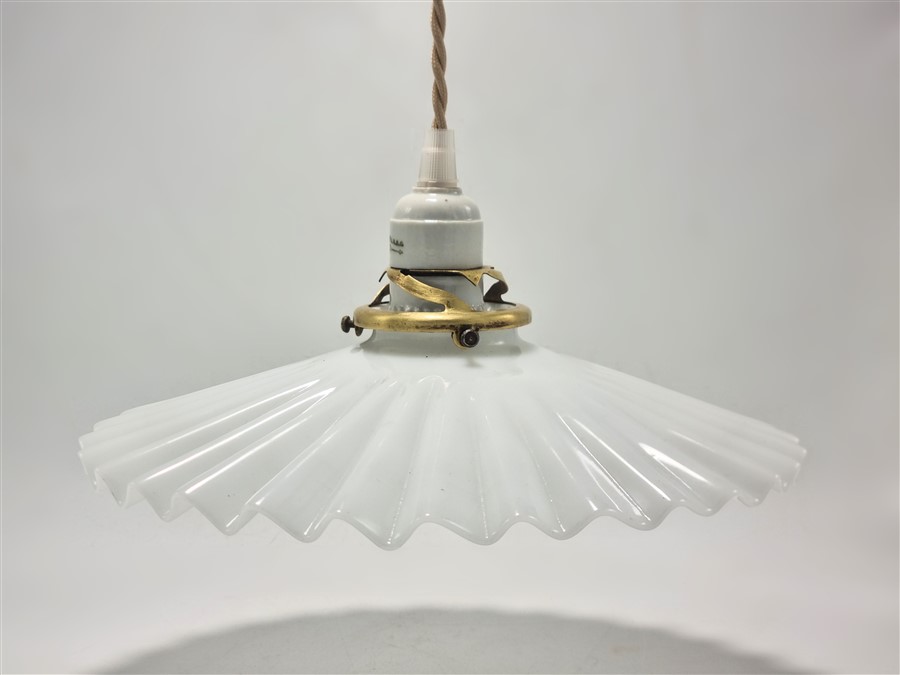 Cette ancienne suspension est en opaline blanche, effet plissé. Elle est munie d’accessoires d’époque : une griffe laitonnée, une douille en céramique et un cache-fixation en porcelaine.